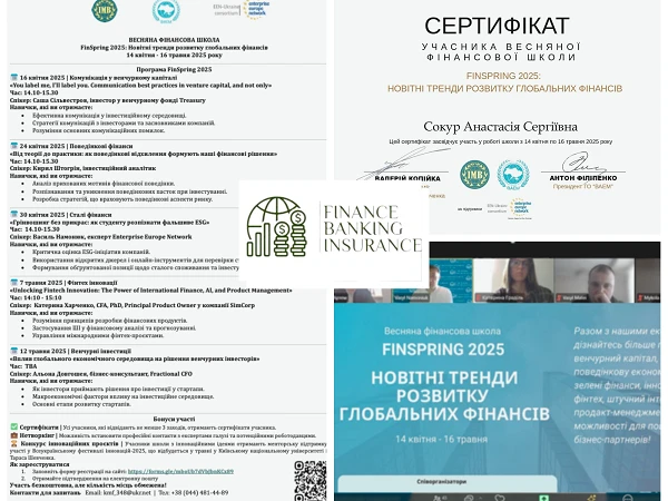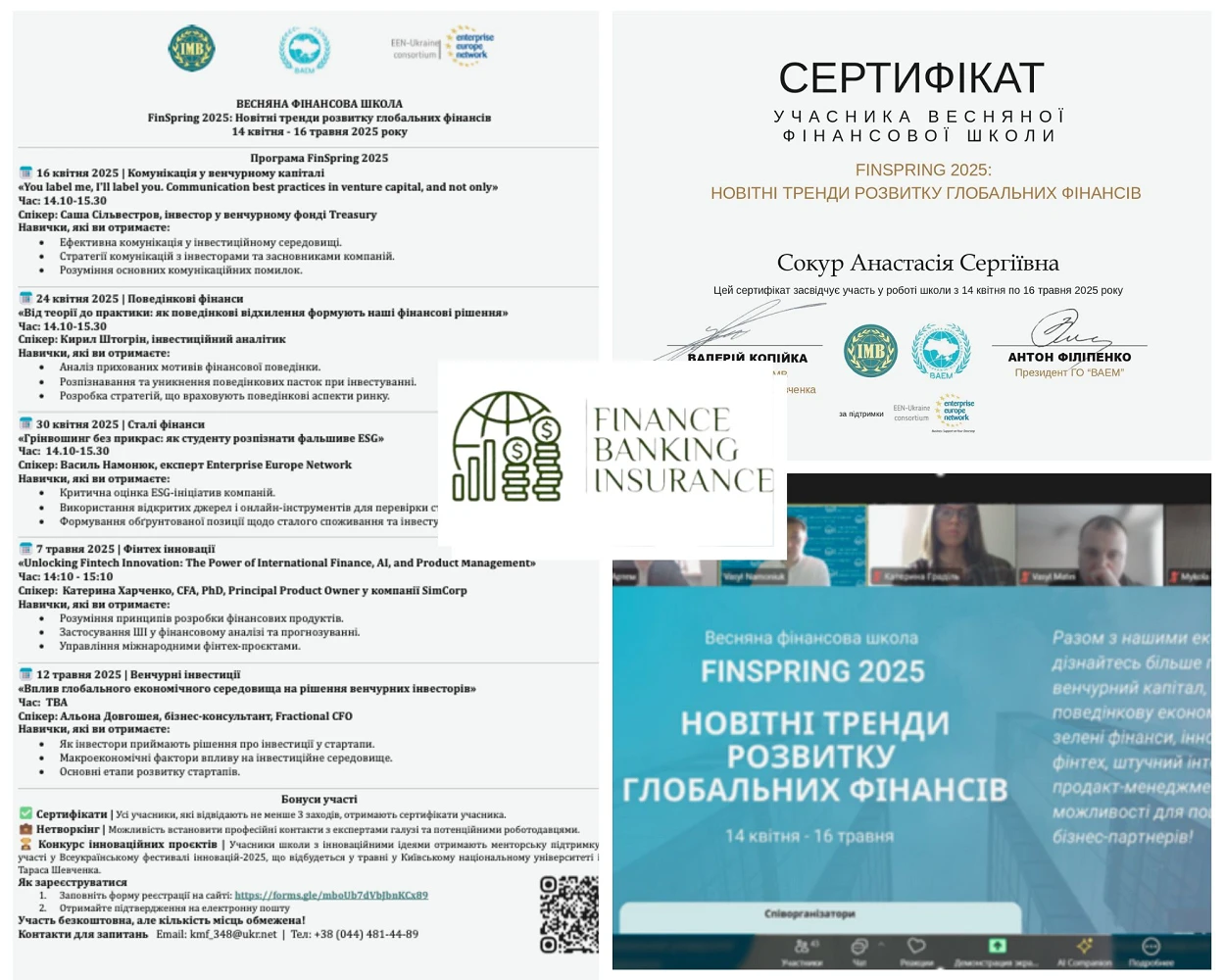 З 14 по 16 квітня 2025 року здобувачка третього курсу першого (бакалаврського) рівня вищої освіти Анастасія СОКУР ОПП «Фінанси, банківська справа та страхування» взяла участь у Весняній фінансовій школі FinSpring 2025 на тему «Новітні тренди розвитку глобальних фінансів», організованій за підтримки Київського національного університету імені Тараса Шевченка, UMB, EEN-Ukraine consortium та Enterprise Europe Network.