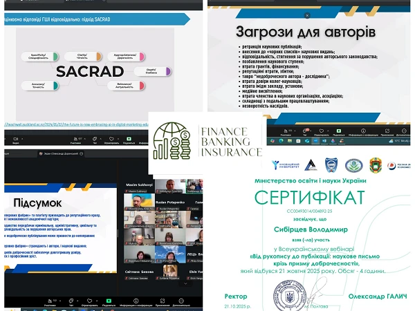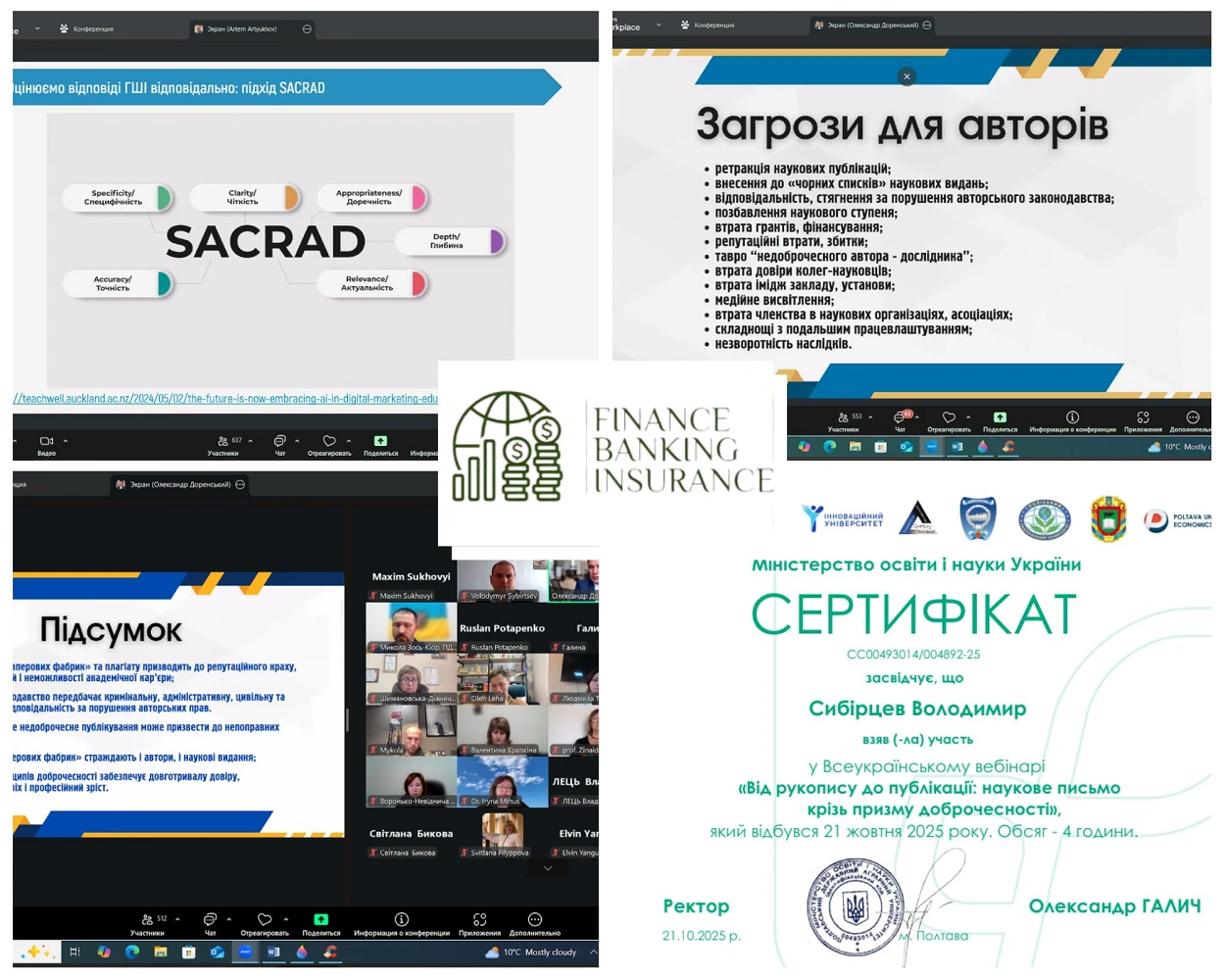 21 жовтня 2025 року завідувач кафедри фінансів, банківської справи та страхування Володимир СИБІРЦЕВ прийняв участь у Всеукраїнському вебінарі «Від рукопису до публікації: наукове письмо крізь призму доброчесності».