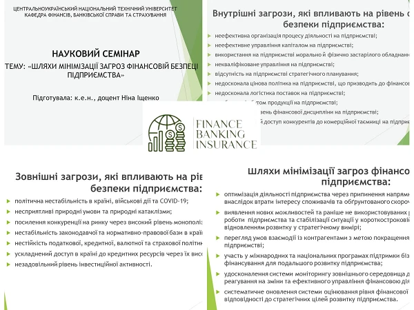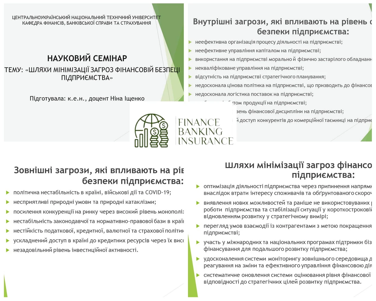10 жовтня 2025 року на кафедрі фінансів, банківської справи та страхування відбувся науковий семінар, у межах якого кандидат економічних наук, доцент Ніна Іщенко презентувала наукове дослідження на тему: «Шляхи мінімізації загроз фінансовій безпеці підприємства». У доповіді було розглянуто завдання, які ставляться перед фінансовою безпекою підприємств в сучасних умовах господарювання. Виокремлено ключові зовнішні та внутрішні загрози, які мають вплив на рівень фінансової безпеки підприємства. Особлива увага була приділена заходам щодо мінімізації загроз фінансовій безпеці підприємства. Науковий семінар проходив за участю науково-педагогічних працівників кафедри у форматі відкритого колективного обговорення, що дало змогу учасникам обмінятися думками щодо вирішення окреслених проблем.