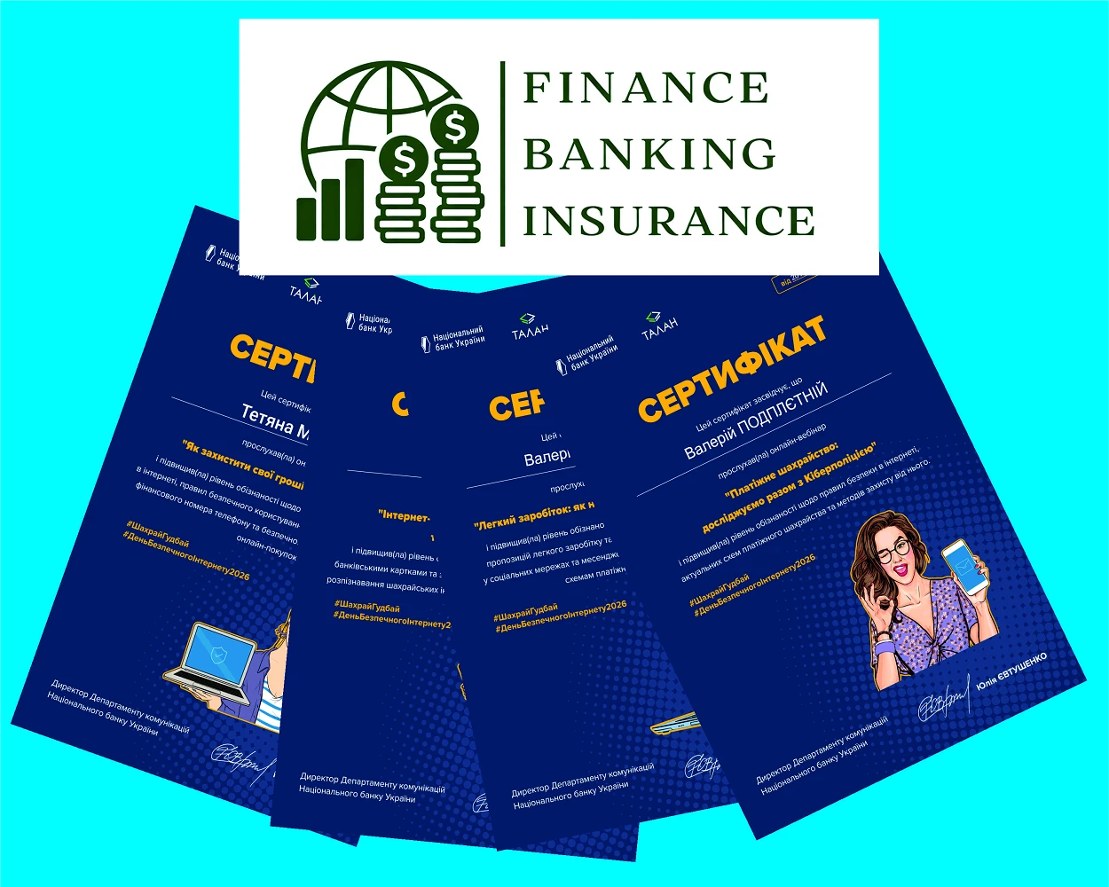 Впродовж тижня 09-13 лютого НПП кафедри ФБСС та здобувачі освіти спеціальності «Фінанси, банківська справа, страхування та фондовий ринок» долучилися до серії з п’яти вебінарів, присвячених актуальним питанням фінансової грамотності, платіжної безпеки та протидії онлайн-шахрайству.