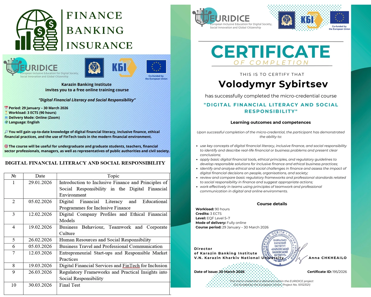 З 29 січня по 30 березня 2026 року завідувач кафедри фінансів, банківської справи та страхувння економічного факультету Центральноукраїнського національного технічного університету Володимир СИБІРЦЕВ успішно пройшов курс підвищення кваліфікації «Digital Financial Literacy and Social Responsibility» (Цифрова фінансова грамотність та соціальна відповідальність). Програма була реалізована Навчально-науковим інститутом «Каразінський банківський інститут» ХНУ імені В. Н. Каразіна в межах масштабного міжнародного проєкту EURIDICE (European Digital Identity for Citizens and Economy).